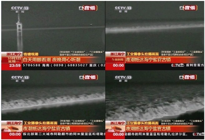 上圖為:央視用保千里夜視儀直播錢塘江畫面(晚上1000米到近距50米不同畫面展示)
