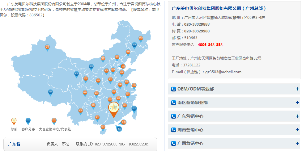 摘要: 廣東美電貝爾科技集團股份有限公司創立于2004年,總部位于廣州,專注于音視頻算法核心技術及物聯網智能感知技術的研發,是領先的智慧主動安防專業解決方案提供商。多年來,先后參與了北京奧運會、廣州亞運會、APEC會議、上海世博會、9.3大閱兵等多項國家及各大城市的重點項目建設,以驕人的成績贏得了政府機構、部隊、用戶及業界的首肯。企業一直以來保持持續、快速增長,于2016年在新三板成功掛牌上市(股票代碼:836502)。